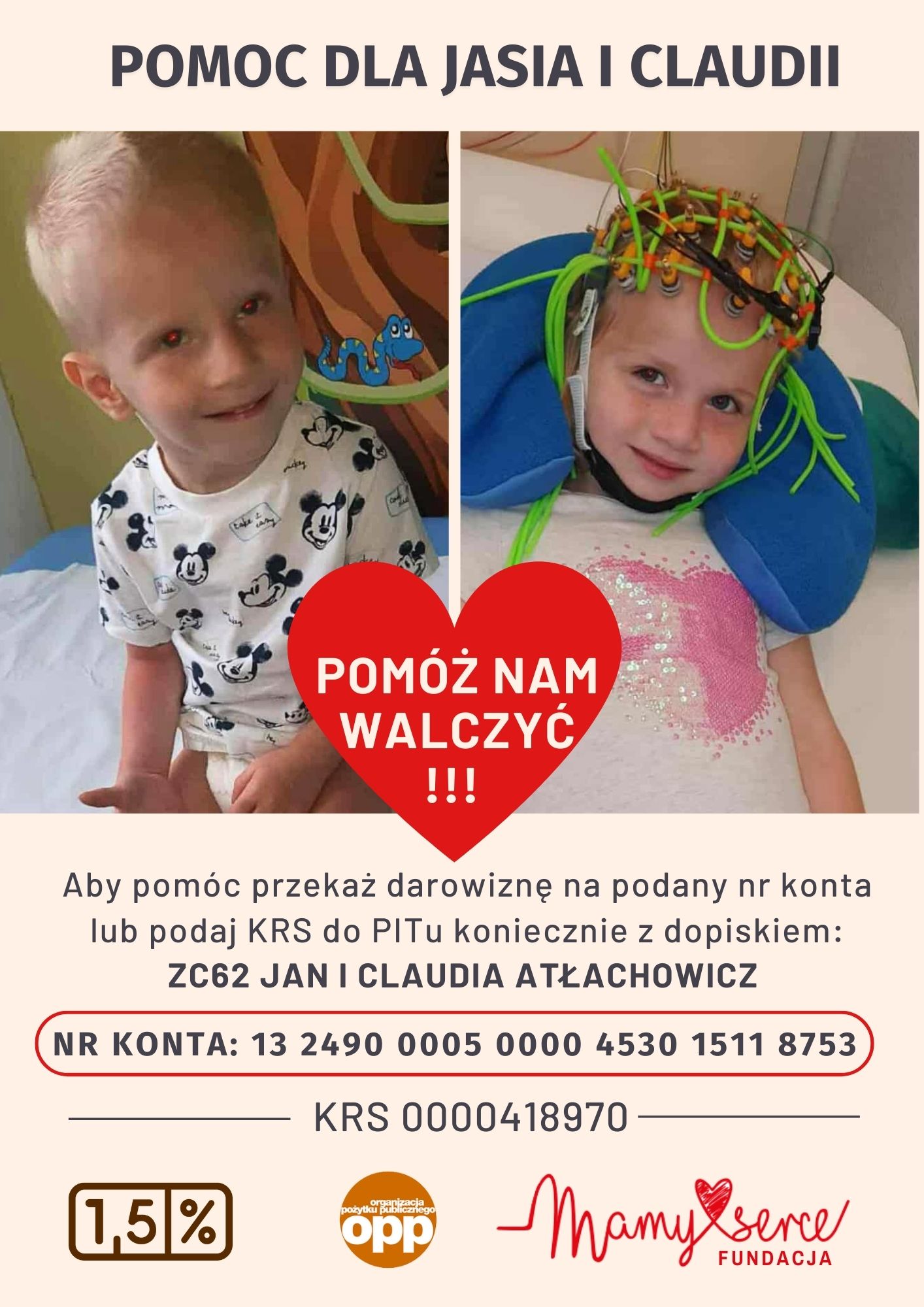 Jasiu urodził się 23 lutego 2019r z ciężką wrodzoną wadą serca – Tetrologia Fallota z hipoplazją zastawki pnia płucnego. Syn od urodzenia jest pod opieką Centrum Zdrowia Matki Polki w Łodzi. Dodatkowo cierpi na mózgowe porażenie dziecięce, ma niedowład prawostronny, skoliozę, nie mówi. Claudia ur. 21 listopad 2016 urodziła się również z wrodzoną wadą serca Tof ma afazje motoryczną, niepełnosprawności intelektualną w stopniu lekkim, adhd, zaburzone przetwarzanie słuchowe. Jesteśmy pod stałą opieką kardiologa, neurologa, ortopedy, endokrynologa, rehabilitantów, gastroenterologa jak również logopedów i neurologopedów. Dzieci potrzebują całodziennej opieki.