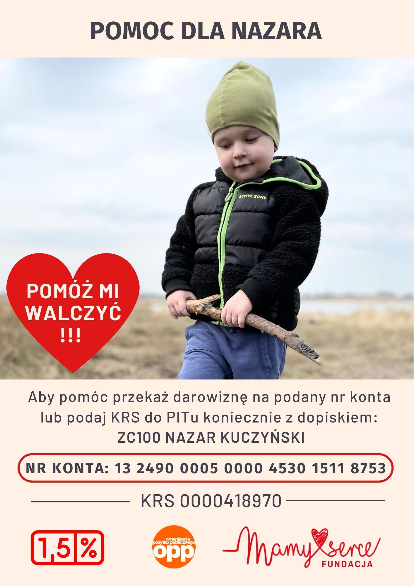 Nazarek urodził się 13 maja 2021 roku w Łodzi w ICZMP,  z wrodzoną złożoną wadą serca pod postacią HLHS ( zespół niedorozwoju lewej części serca). Nazar ma za sobą już wiele ciężkich chwil. Przeszedł trzyetapowe leczenie operacyjne oraz kilka cewnikowań serduszka. Nazar cały czas pozostaje pod stałą opieką kardiologa w ICZMP, wymagają ciągłego leczenia.